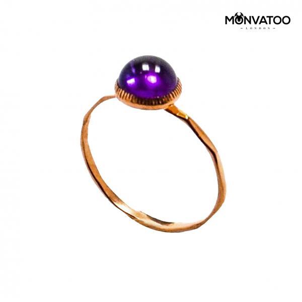 This rosy amethyst knuckle ring is handcrafted from 18ct rose gold vermeil over silver with a 1.60 ct natural cabochon amethyst gemstone. The ring band is hand-hammered; each stroke is unique, making it unevenly round throughout the band with 1-2 mm width. This hammered band reflects the light and gives the ring an exquisite charm.