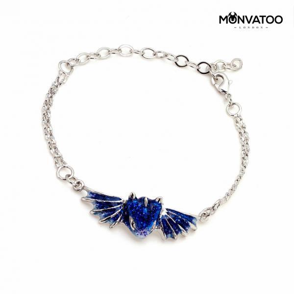 This silver sapphire dragon bracelet is handcrafted from rhodium plated over brass with hand-painted and enamelled detail. It has an adjustable length of 14-19cm.